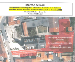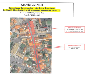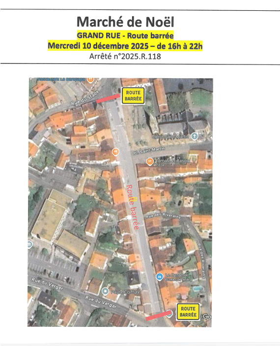 ATTENTION : La Grand’rue restera ouverte à la circulation jusqu’à 16h. Elle sera ensuite fermée jusqu’à la fin du marché de Noël. Le stationnement y sera interdit à compter de 13h30 ce mercredi 10 décembre.
