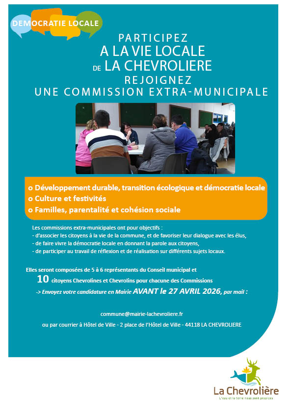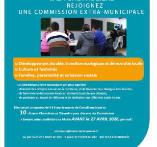 Si vous êtes intéressés, envoyez votre candidature à l’attention de M. Le Maire avant le 27 avril 2026 soit par mail à commune@mairie-lachevroliere.fr, soit par courrier en mairie (2, place de l’Hôtel de Ville).